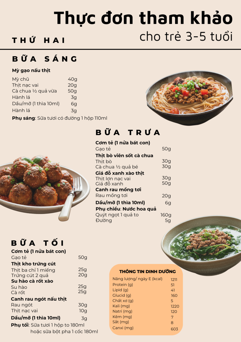 Giai đoạn 3–5 tuổi là thời kỳ trẻ phát triển nhanh cả về thể chất lẫn trí tuệ, nhu cầu năng lượng và dinh dưỡng tăng cao. Một thực đơn hợp lý, cân đối giữa các nhóm thực phẩm sẽ giúp trẻ ăn ngon, tăng trưởng tốt và phòng tránh thiếu vi chất. Bài viết giới thiệu thực đơn mẫu cho trẻ 3–5 tuổi được xây dựng dựa trên khuyến nghị của Viện Dinh dưỡng, đảm bảo đủ năng lượng, cân đối giữa các nhóm thực phẩm và phù hợp với khẩu phần khuyến nghị hằng ngày cho lứa tuổi mầm non.