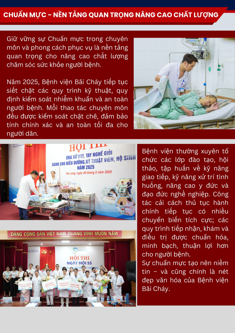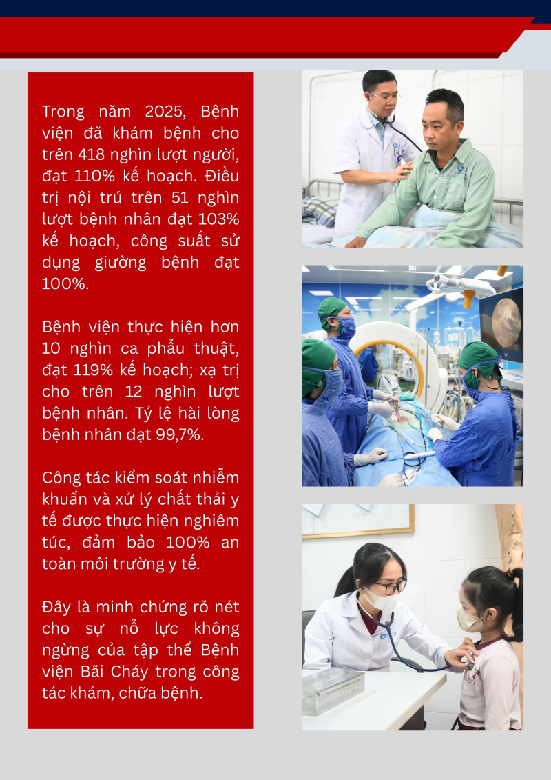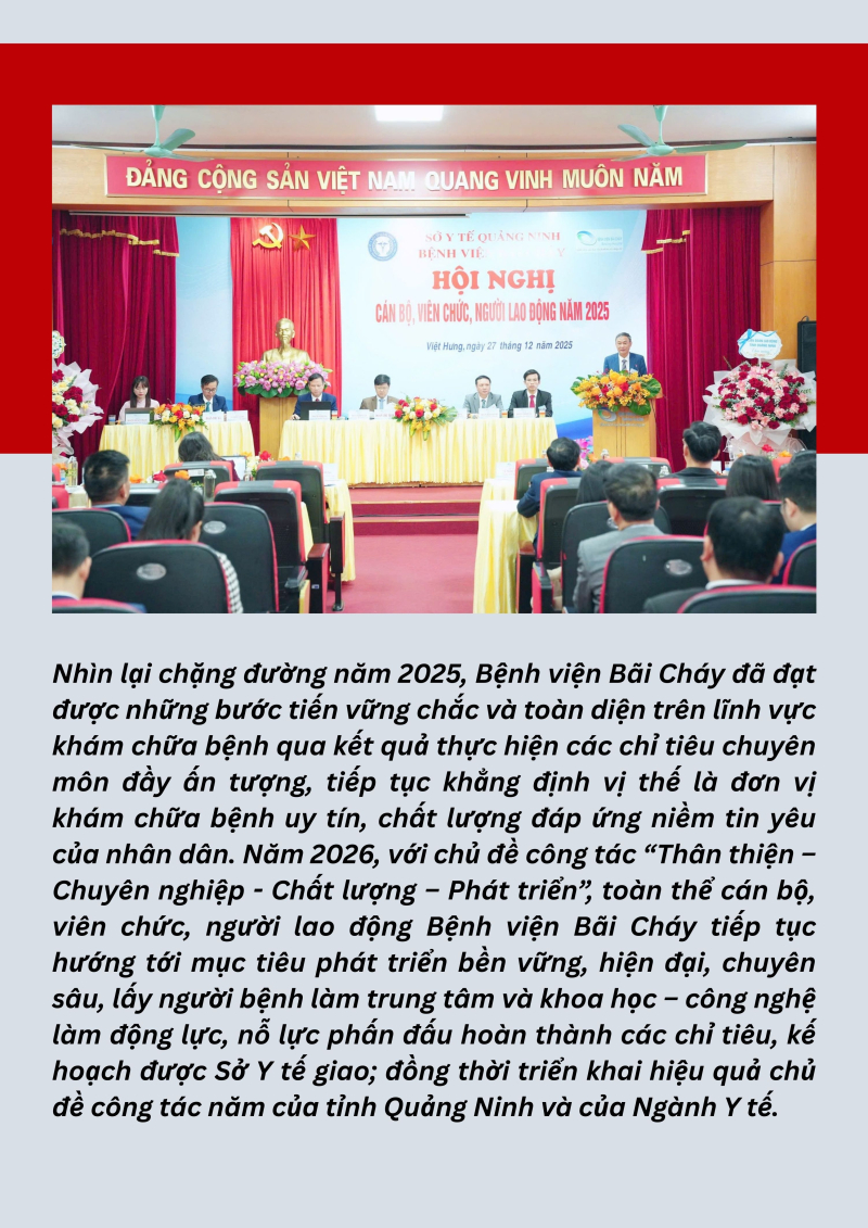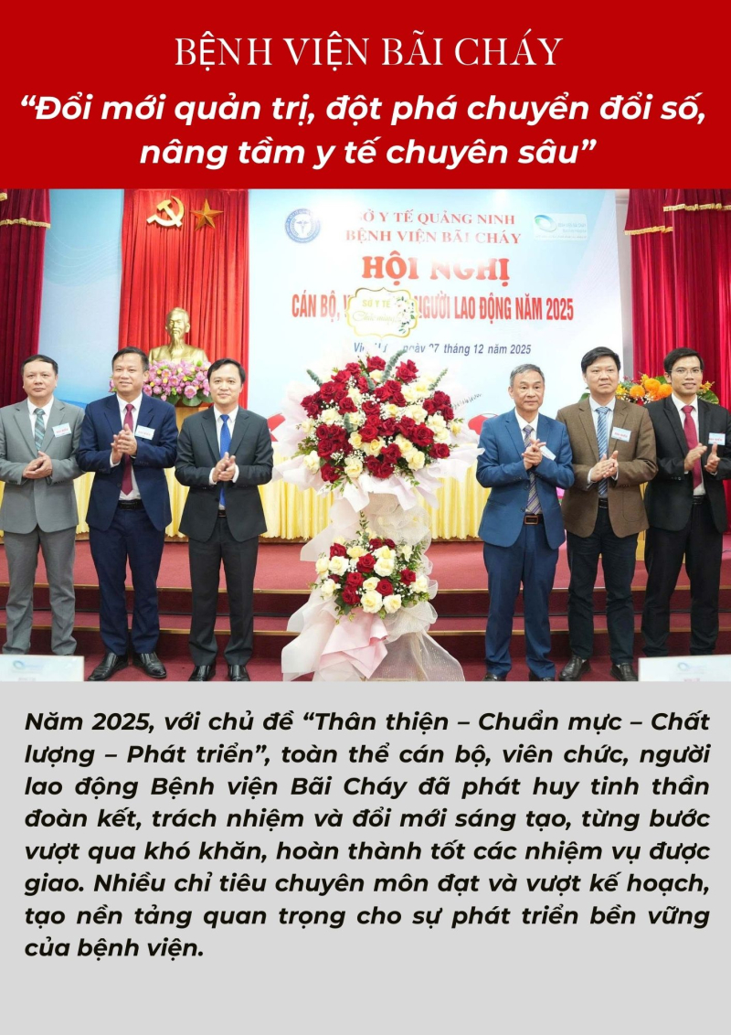 Năm 2025, với chủ đề “Thân thiện – Chuẩn mực – Chất lượng – Phát triển”, toàn thể cán bộ, viên chức, người lao động Bệnh viện Bãi Cháy đã phát huy tinh thần đoàn kết, trách nhiệm và đổi mới sáng tạo, từng bước vượt qua khó khăn, hoàn thành tốt các nhiệm vụ được giao. Nhiều chỉ tiêu chuyên môn đạt và vượt kế hoạch, tạo nền tảng quan trọng cho sự phát triển bền vững của bệnh viện.