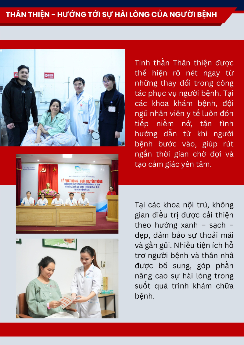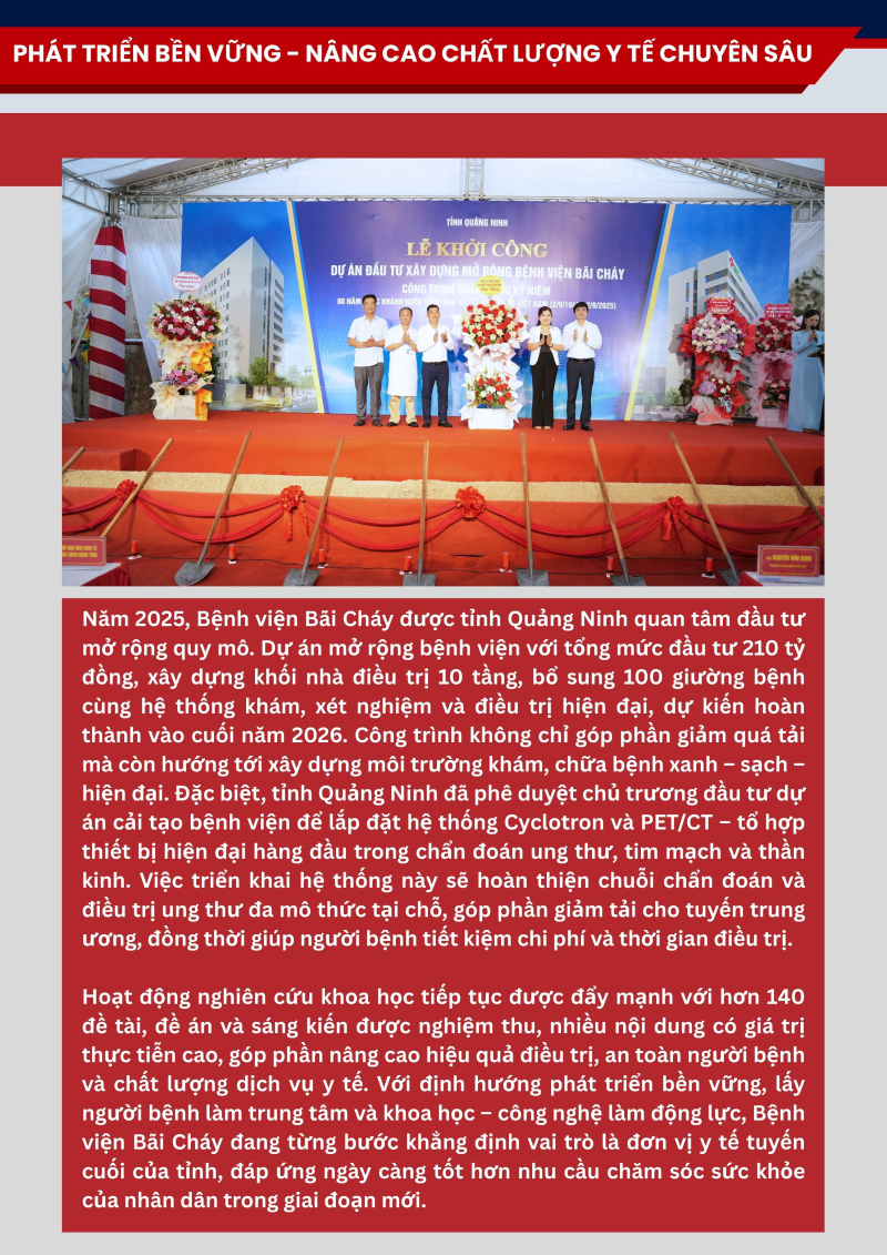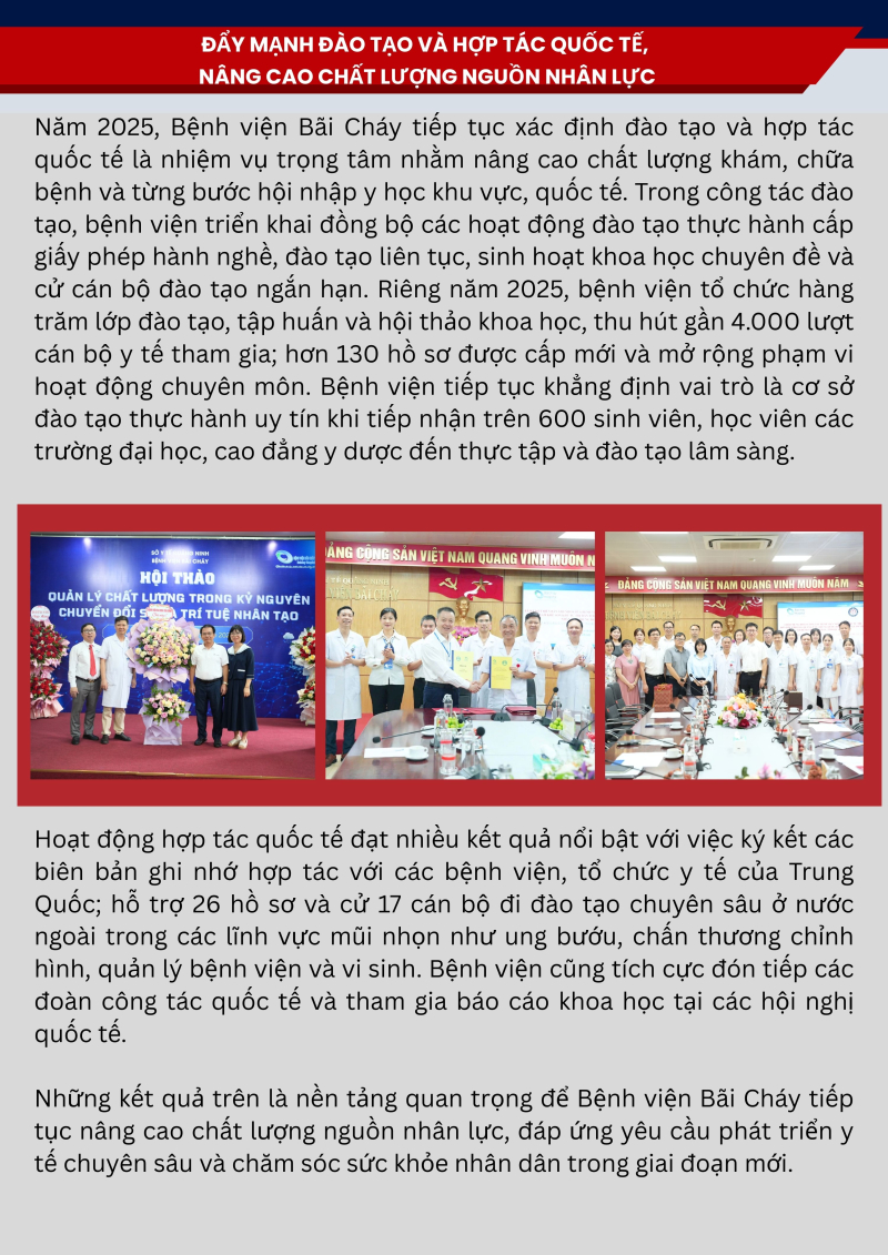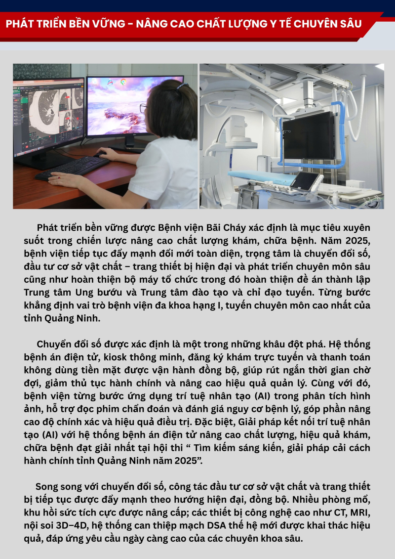 Năm 2025, với chủ đề “Thân thiện – Chuẩn mực – Chất lượng – Phát triển”, toàn thể cán bộ, viên chức, người lao động Bệnh viện Bãi Cháy đã phát huy tinh thần đoàn kết, trách nhiệm và đổi mới sáng tạo, từng bước vượt qua khó khăn, hoàn thành tốt các nhiệm vụ được giao. Nhiều chỉ tiêu chuyên môn đạt và vượt kế hoạch, tạo nền tảng quan trọng cho sự phát triển bền vững của bệnh viện.
