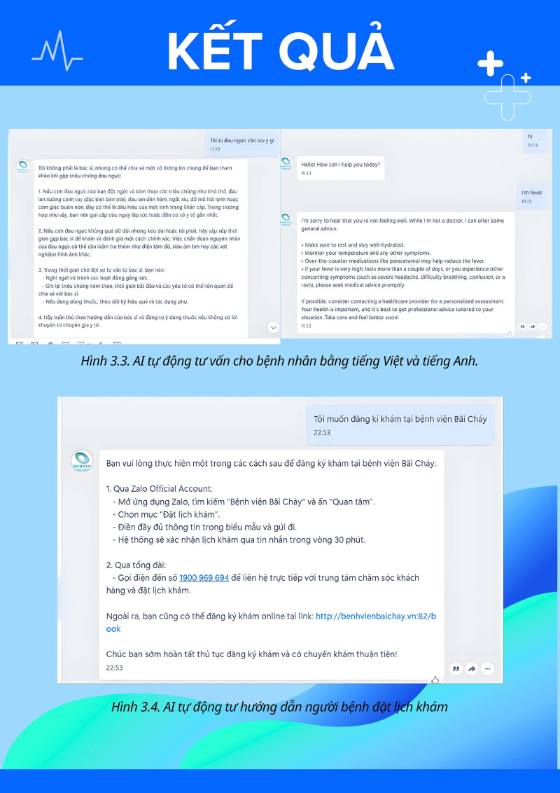 Hệ thống AI Agent hoạt động như một trợ lý ảo y tế thông minh, ứng dụng trí tuệ nhân tạo và xử lý ngôn ngữ tự nhiên, cho phép tự động tư vấn, hướng dẫn thủ tục khám chữa bệnh, đặt lịch khám, tra cứu kết quả xét nghiệm và cung cấp thông tin y tế cho người bệnh 24/7 ngay trên Zalo. Trợ lý ảo có khả năng hiểu và phản hồi bằng tiếng Việt, tiếng Anh, đồng thời ghi nhớ lịch sử tương tác để cá nhân hóa nội dung tư vấn.