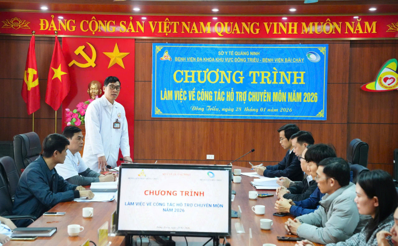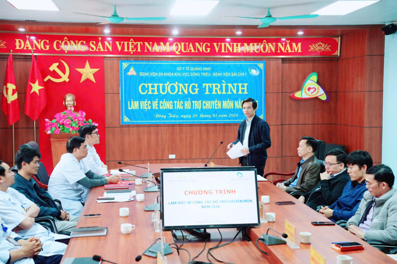 Thực hiện sự chỉ đạo của Sở Y tế Quảng Ninh về việc phân công nhiệm vụ hỗ trợ, chỉ đạo chuyên môn kỹ thuật đối với các đơn vị y tế công lập trên địa bàn tỉnh năm 2026, chiều ngày 28/01/2026, Bệnh viện Bãi Cháy đã cử đoàn công tác đến làm việc, khảo sát và thống nhất nội dung hỗ trợ chuyên môn cho Bệnh viện Đa khoa khu vực Đông Triều.