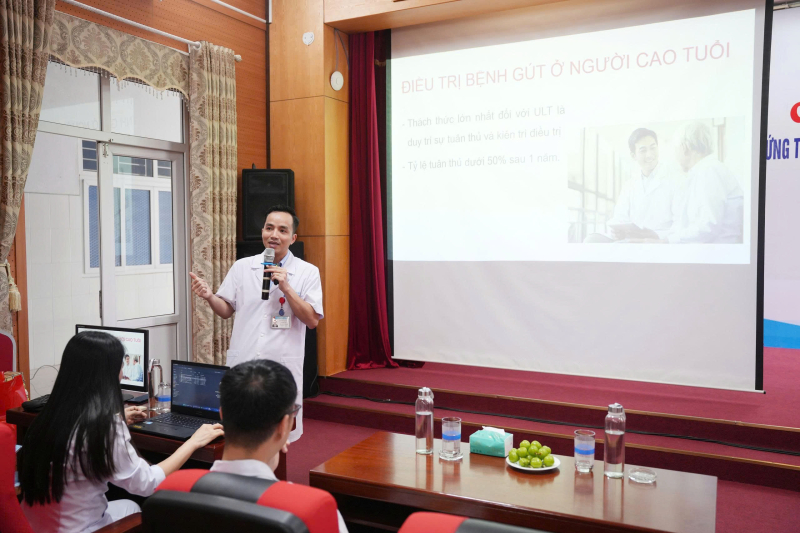 Với chuyên đề “Bệnh Gút ở người cao tuổi”, BSCKI. Nguyễn Xuân Thủy, Phó Trưởng Khoa Lão khoa - Cơ xương khớp đã nhấn mạnh tầm quan trọng của kiểm soát acid uric máu, chế độ ăn uống và tuân thủ điều trị lâu dài. Bệnh gút ở người cao tuổi thường tiến triển âm thầm, ảnh hưởng nhiều khớp, dễ nhầm với các bệnh xương khớp khác và thường kèm theo tăng huyết áp, đái tháo đường, bệnh thận mạn… khiến việc điều trị trở nên phức tạp hơn, ảnh hưởng đến khả năng vận động và chất lượng cuộc sống của người bệnh. Vì vậy, quá trình điều trị cần chú trọng lối sống lành mạnh, duy trì chế độ ăn uống hợp lý, hạn chế rượu bia, tập luyện thường xuyên, kiểm soát bệnh nền và tuân thủ điều trị lâu dài, tái khám định kỳ để điều chỉnh thuốc phù hợp.