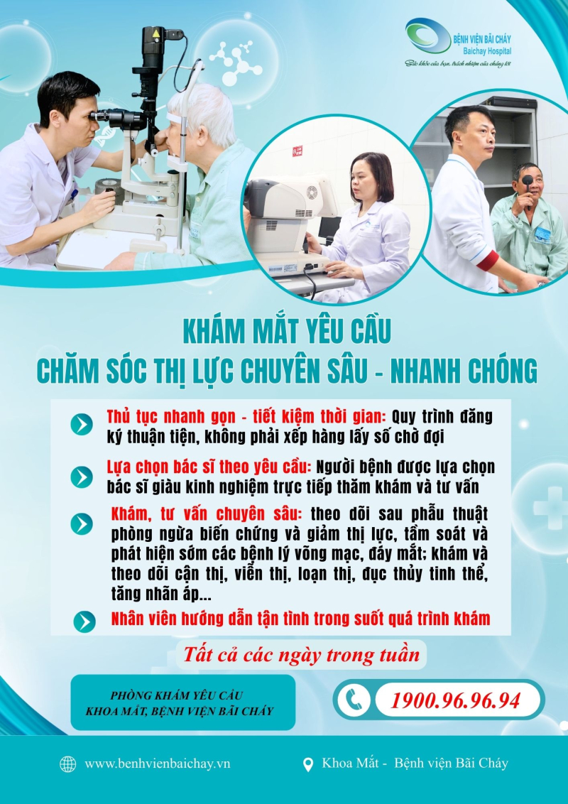 Nhằm đáp ứng nhu cầu chăm sóc sức khỏe mắt ngày càng cao của người dân, Khoa Mắt – Bệnh viện Bãi Cháy triển khai Phòng khám Mắt theo yêu cầu, mang đến dịch vụ thăm khám chuyên sâu, nhanh chóng và thuận tiện cho cả bệnh nhân tái khám và người dân có nhu cầu kiểm tra thị lực định kỳ.