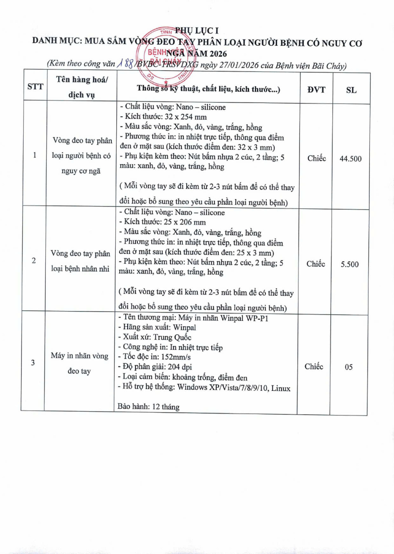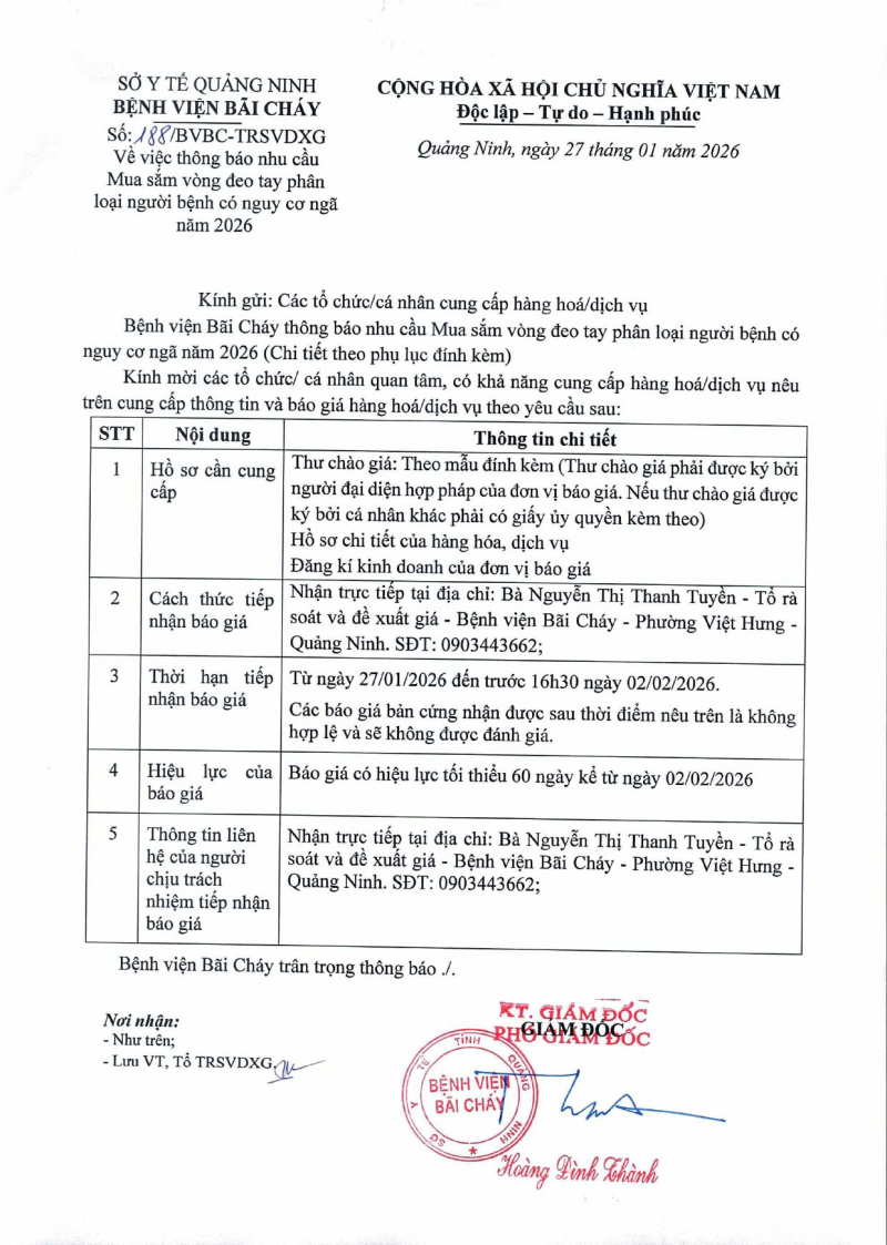 Thông báo số 188 về nhu cầu mua sắm vòng đeo tay phân loại người bệnh có nguy cơ ngã năm 2026 2026/01/27 08:31