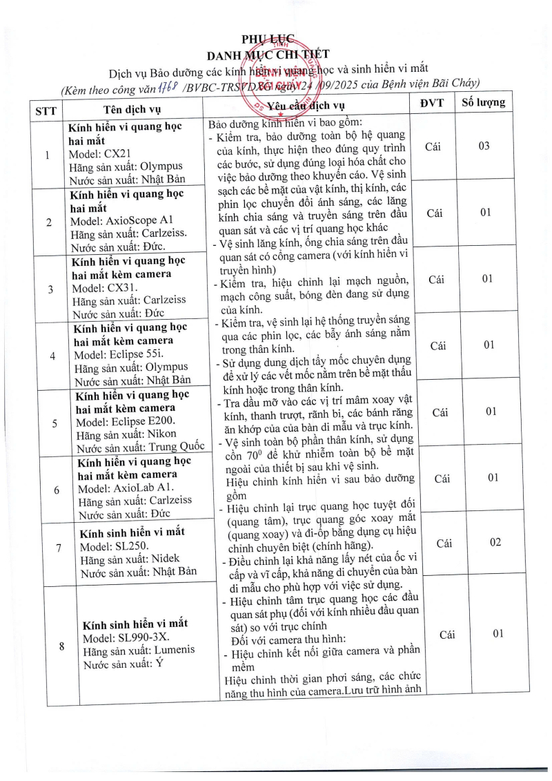 Thông báo 1768 nhu cầu dịch vụ bảo dưỡng các kính hiển vi quang học và sinh hiển vi mắt