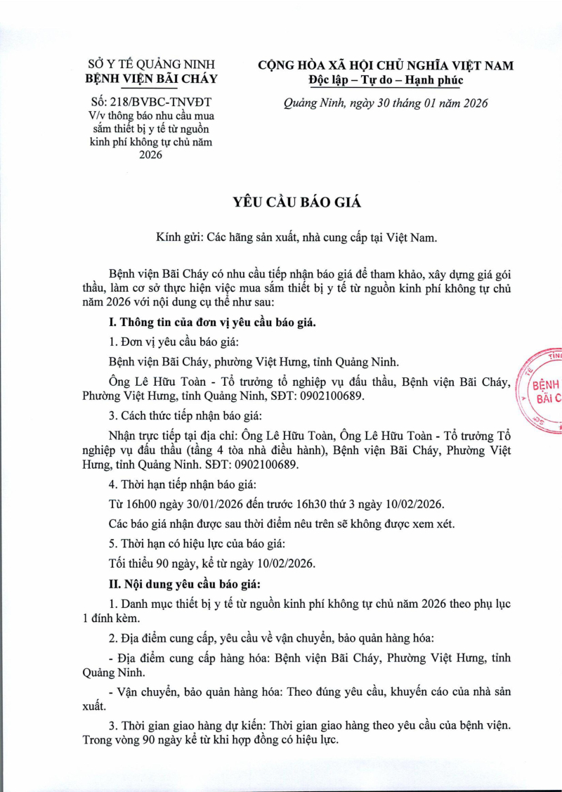 Thông báo 218 nhu cầu mua sắm thiết bị y tế nguồn kinh phí không tự chủ năm 2026