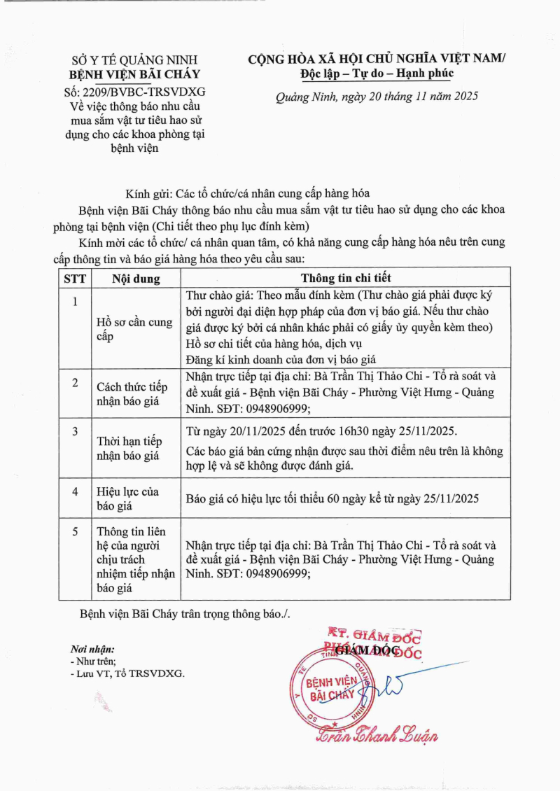 Thông báo 2209 nhu cầu mua sắm vật tư tiêu hao sử dụng cho các khoa phòng tại bệnh viện