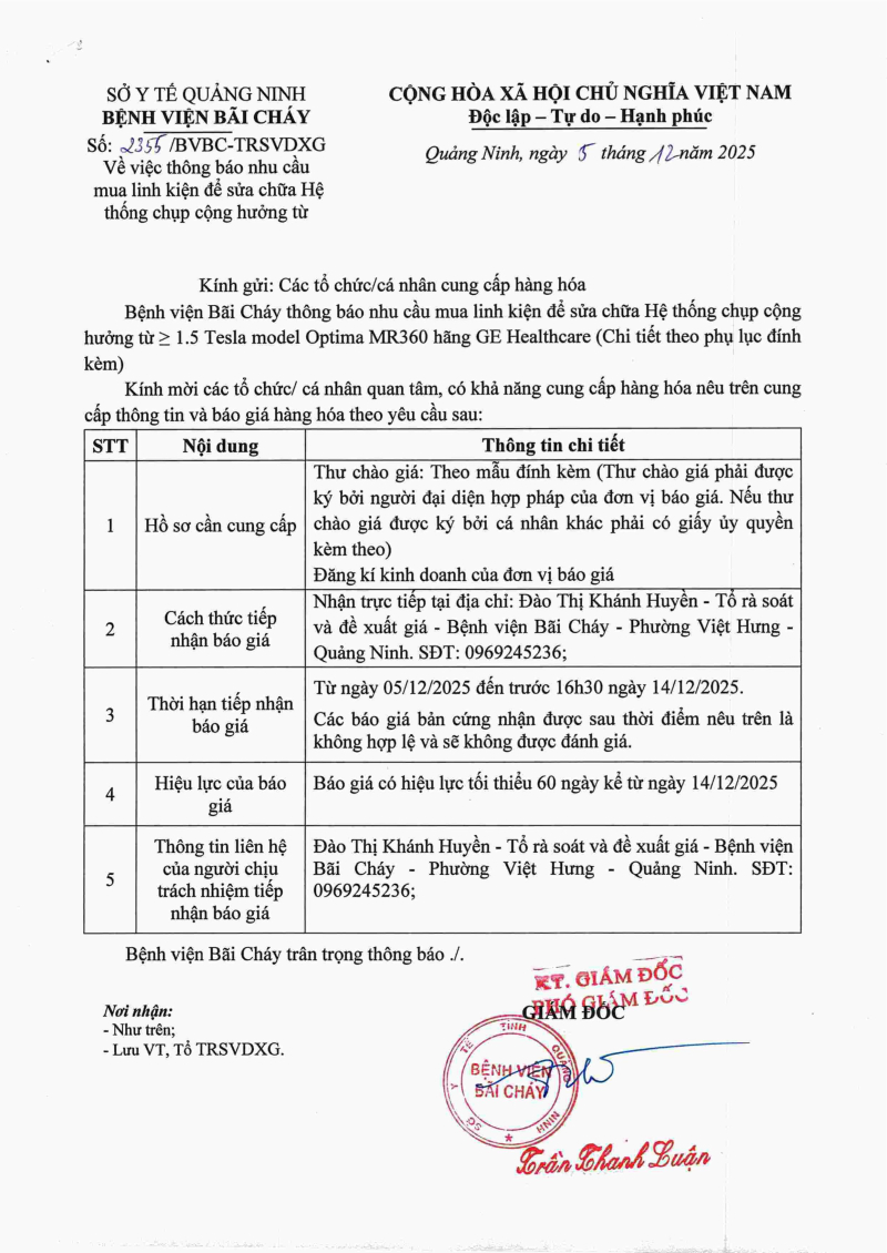 Thông báo 2355 nhu cầu mua linh kiện để sửa chữa hệ thống chụp cộng hưởng từ 2025/12/08 09:40 Thông báo 2355 nhu cầu mua linh kiện để sửa chữa hệ thống chụp cộng hưởng từ