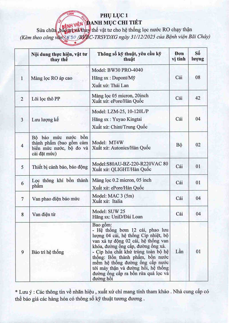 Thông báo 2590 nhu cầu sửa chữa, bảo trì và thay thế vật tư cho hệ thống lọc nước RO chạy thận\