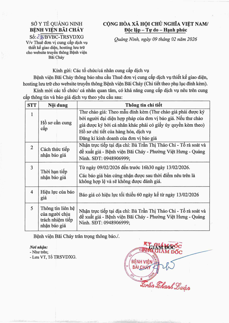 Thông báo 276 thuê đơn vị cung cấp dịch vụ thiết kế giao diện website, hosting lưu trữ cho website truyền thông bệnh viện