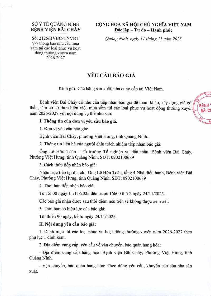 Thông báo số 2125 về nhu sắm túi các loại phục vụ thường xuyên năm 2026,2027