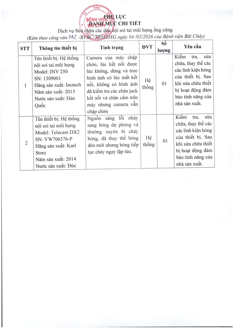 Thông báo số 242 về nhu cầu dịch vụ sửa chữa các dàn nội soi tai mũi họng ống cứng