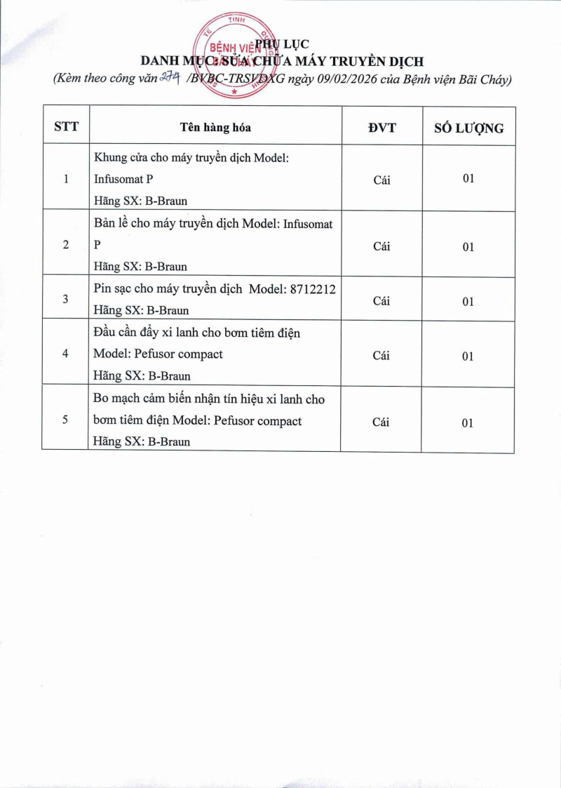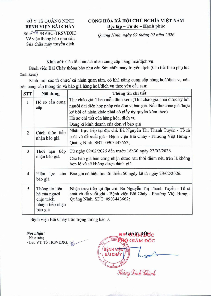 Thông báo số 274 về nhu cầu sửa chữa máy truyền dịch