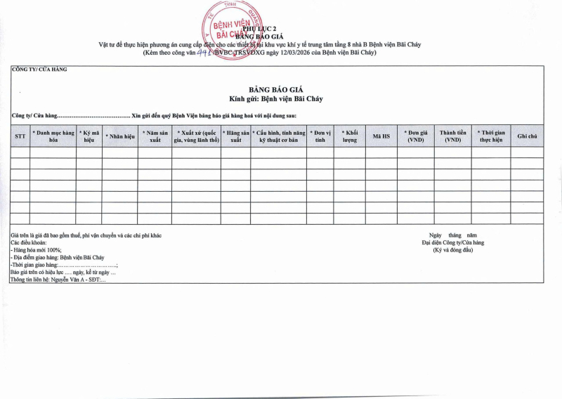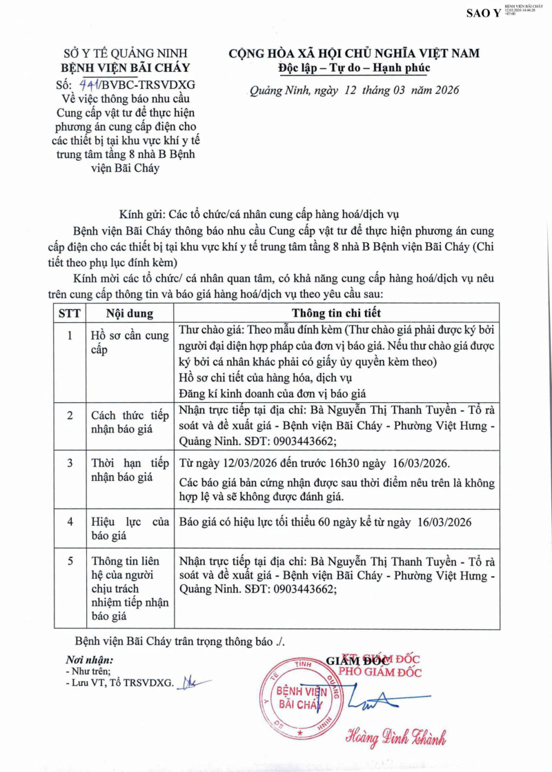 Thông báo số 441 về nhu cầu cung cấp vật tư để thực hiện phương án cung cấp điện cho các thiết bị tại khu vực y tế trung tâm tầng 8 nhà B Bệnh viện Bãi Cháy Hôm nay 09:51