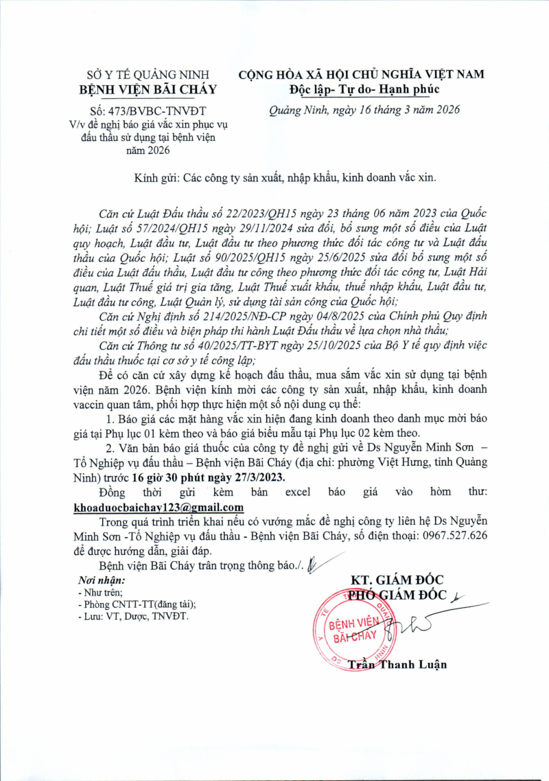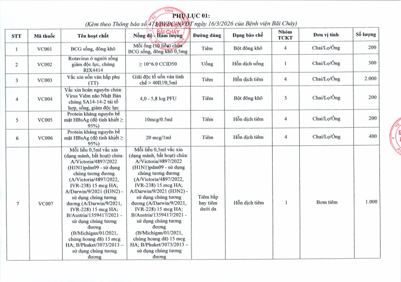 Thông báo số 473 về nhu cầu báo giá vắc xin phục vụ đấu thầu sử dụng tại bệnh viện năm 2026 2026/03/16 09:49