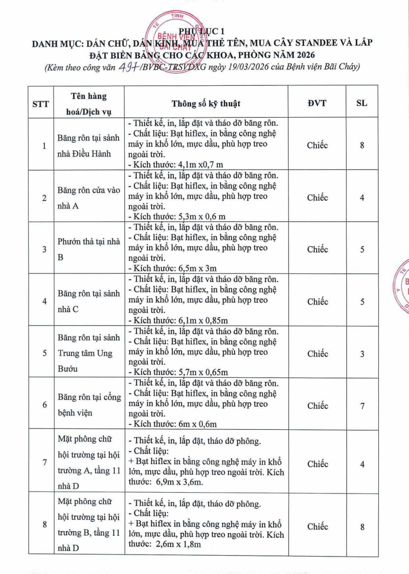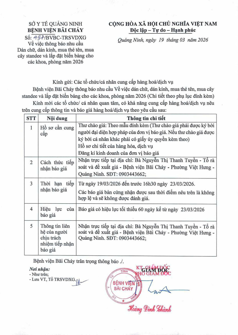Thông báo số 497 về nhu cầu dán chữ, dán kính, mua thẻ tên, mua cây standee và lắp đặt biển bảng cho các khoa, phòng năm 2026 2026/03/19 06:38