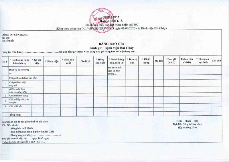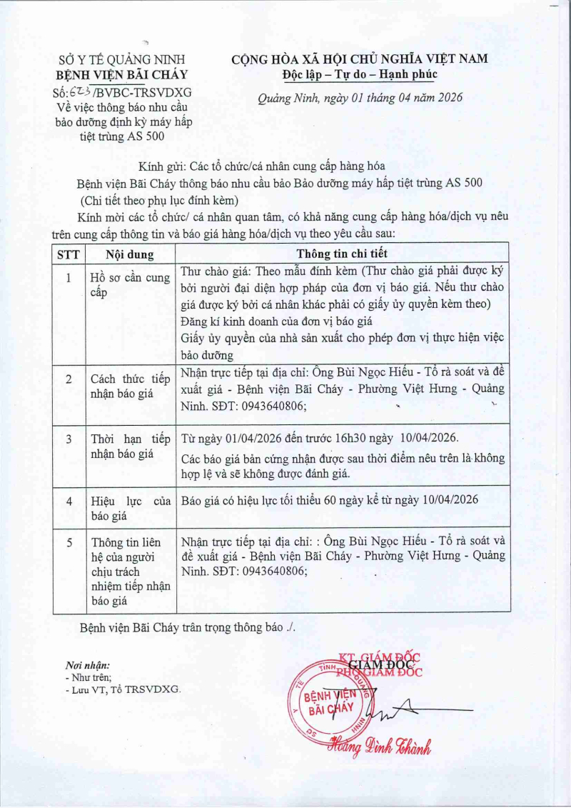 Thông báo số 622 về nhu cầu bảo dưỡng định kỳ máy hấp tiệt trùng HS–5035