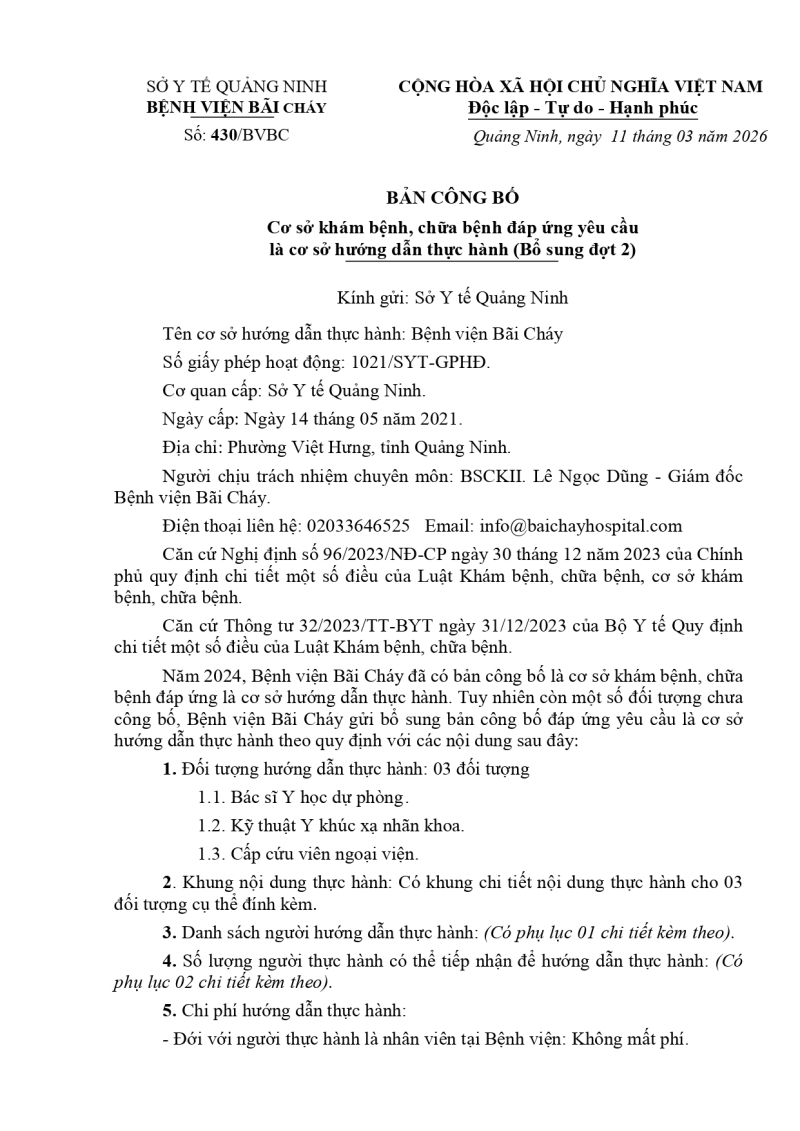 Thông báo số 430 về việc công bố cơ sở khám chữa bệnh Bệnh viện Bãi Cháy là cơ sở hướng dẫn thực hành bổ sung đợt 2