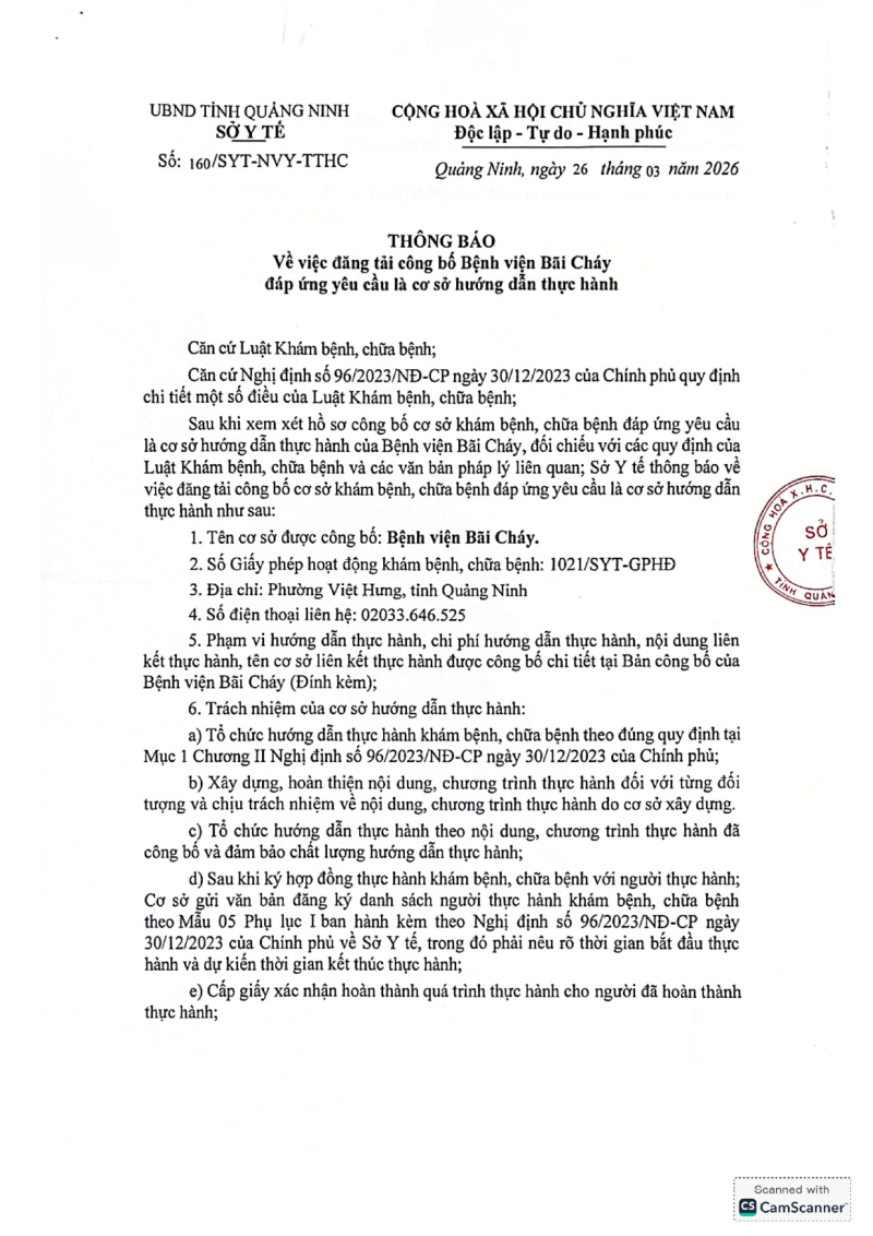 Thông báo 160 về việc công bố Bệnh viện Bãi Cháy đáp ứng yêu cầu cơ sở hướng dẫn thực hành 2026/03/30 08:34