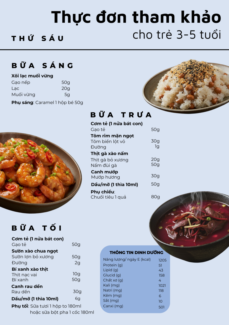 Giai đoạn 3–5 tuổi là thời kỳ trẻ phát triển nhanh cả về thể chất lẫn trí tuệ, nhu cầu năng lượng và dinh dưỡng tăng cao. Một thực đơn hợp lý, cân đối giữa các nhóm thực phẩm sẽ giúp trẻ ăn ngon, tăng trưởng tốt và phòng tránh thiếu vi chất. Bài viết giới thiệu thực đơn mẫu cho trẻ 3–5 tuổi được xây dựng dựa trên khuyến nghị của Viện Dinh dưỡng, đảm bảo đủ năng lượng, cân đối giữa các nhóm thực phẩm và phù hợp với khẩu phần khuyến nghị hằng ngày cho lứa tuổi mầm non.