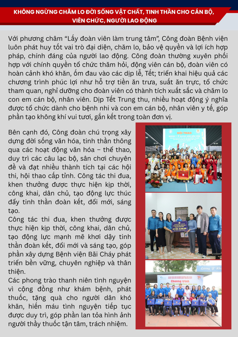 Năm 2025, với chủ đề “Thân thiện – Chuẩn mực – Chất lượng – Phát triển”, toàn thể cán bộ, viên chức, người lao động Bệnh viện Bãi Cháy đã phát huy tinh thần đoàn kết, trách nhiệm và đổi mới sáng tạo, từng bước vượt qua khó khăn, hoàn thành tốt các nhiệm vụ được giao. Nhiều chỉ tiêu chuyên môn đạt và vượt kế hoạch, tạo nền tảng quan trọng cho sự phát triển bền vững của bệnh viện.