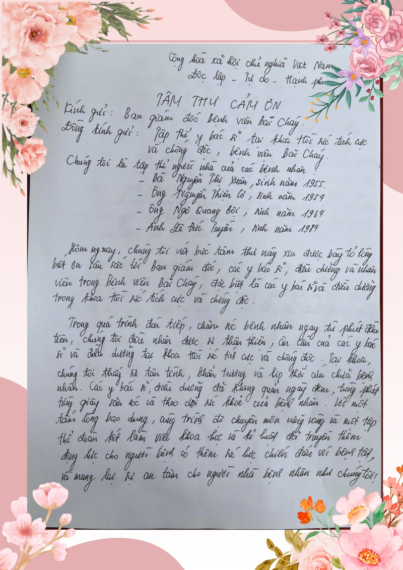 Trong thư, tập thể người nhà các bệnh nhân: bà Nguyễn Thị Xuân (sinh năm 1955), ông Nguyễn Thiên Cơ (sinh năm 1957), ông Ngô Quang Bởi (sinh năm 1969), anh Lê Đức Tuyên (sinh năm 1979)… đã bày tỏ lòng biết ơn sâu sắc tới Ban Giám đốc bệnh viện cùng toàn thể y, bác sĩ, điều dưỡng và nhân viên y tế, đặc biệt là đội ngũ Khoa Hồi sức tích cực và Chống độc.