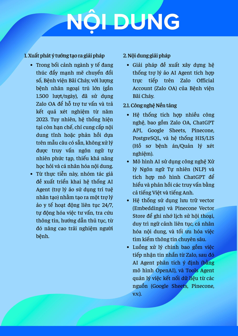 Trong bối cảnh chuyển đổi số y tế mạnh mẽ, với mục tiêu nâng cao trải nghiệm dịch vụ y tế, Bệnh viện Bãi Cháy đã nghiên cứu, xây dựng và triển khai hệ thống AI Agent hỗ trợ tư vấn và tra cứu thông tin y tế trên nền tảng Zalo Official Account (Zalo OA). Giải pháp đã được trao Giải Khuyến khích tại Hội thi Sáng tạo kỹ thuật tỉnh Quảng Ninh lần thứ X (2024 – 2025).