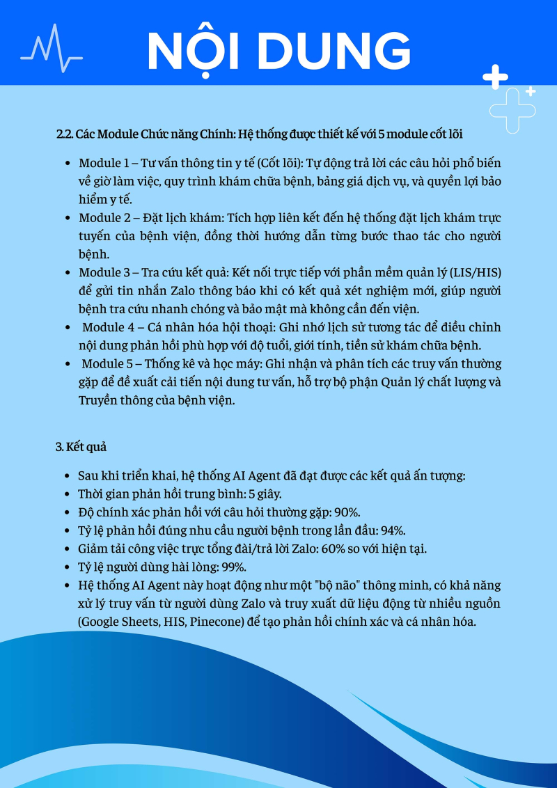 Hệ thống AI Agent hoạt động như một trợ lý ảo y tế thông minh, ứng dụng trí tuệ nhân tạo và xử lý ngôn ngữ tự nhiên, cho phép tự động tư vấn, hướng dẫn thủ tục khám chữa bệnh, đặt lịch khám, tra cứu kết quả xét nghiệm và cung cấp thông tin y tế cho người bệnh 24/7 ngay trên Zalo. Trợ lý ảo có khả năng hiểu và phản hồi bằng tiếng Việt, tiếng Anh, đồng thời ghi nhớ lịch sử tương tác để cá nhân hóa nội dung tư vấn.