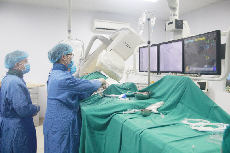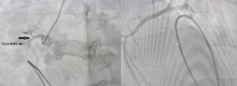 Trong quá trình theo dõi sát tình trạng và làm lại xét nghiệm men tim, sau 2 tiếng, bệnh nhân xuất hiện tình trạng đau ngực, vã mồ hôi trở lại, huyết áp tụt 60/40mmgHg, nhịp tim chậm 39 lần/phút. Ngay lập tức, các bác sĩ đã xử trí nâng huyết áp, chuyển thẳng bệnh nhân đến phòng can thiệp tim mạch đặt máy tạo nhịp tim tạm thời với điện cực trong buồng tim. Kết quả chụp mạch vành trên hệ thống chụp mạch số hóa xóa nền DSA phát hiện động mạch vành phải tắc hoàn cuối đoạn 1.