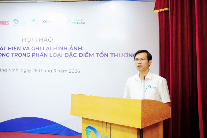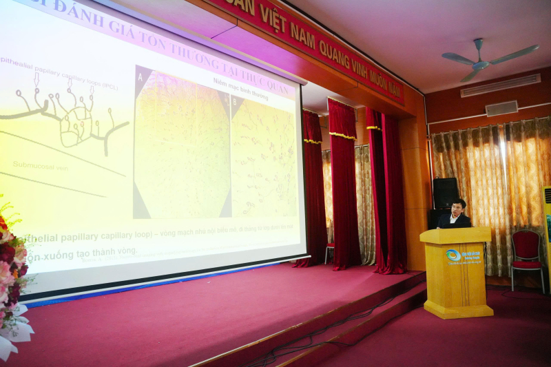 Bác sĩ Hoàng Văn Huân – Khoa Nội tiêu hóa, Bệnh viện Bãi Cháy trình bày chuyên đề “Tổng quan và ý nghĩa lâm sàng của phát hiện sớm ung thư đường tiêu hóa giai đoạn sớm”, nhấn mạnh ý nghĩa của việc phát hiện ung thư sớm đường tiêu hóa và điều trị bằng các kỹ thuật ít xâm lấn như EMR (cắt hớt niêm mạc) hoặc ESD (cắt tách dưới niêm mạc) giúp bảo tồn 100% giải phẫu và chức năng sinh lý cơ quan; tăng tỷ lệ sống còn (tại Nhật Bản, tỷ lệ sống sót sau 5 năm của ung thư dạ dày sớm đạt trên 90%); Vai trò của trí tuệ nhân tạo (AI) trong hỗ trợ phát hiện và phân loại tổn thương nội soi.