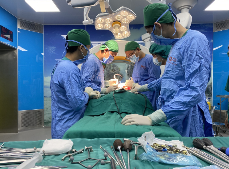 Kíp phẫu thuật do bác sĩ CKII Lê Triệu Linh, Phó trưởng khoa Ngoại thần kinh – Lồng ngực, Bệnh viện Bãi Cháy cùng ê kíp phẫu thuật đã tiến hành phẫu thuật giải phóng cấu trúc biến dạng, chỉnh trục cột sống và cố định bằng các thanh nẹp – vít chuyên dụng. Sau mổ, cột sống được đưa về trục cân đối tự nhiên, giải phóng áp lực lên các rễ thần kinh.