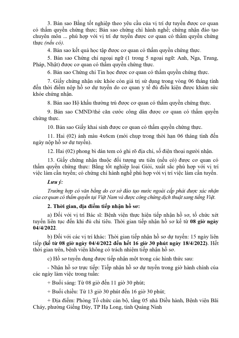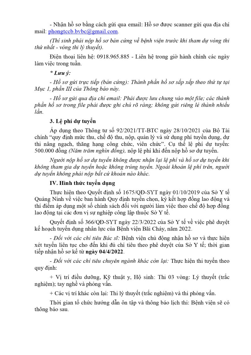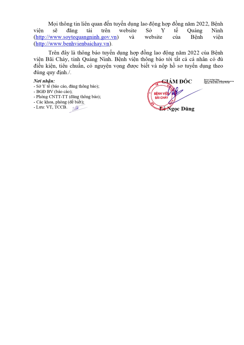 Bệnh viện Bãi Cháy ban hành công văn số 353/TB-BVBC ngày 30/3/2022 về Tuyển dụng hợp đồng lao động năm 2022.