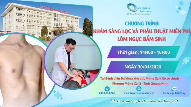 Nhằm tăng cường công tác chăm sóc sức khỏe trẻ em và phát hiện sớm các dị tật bẩm sinh có nguy cơ ảnh hưởng đến sự phát triển thể chất – chức năng tim phổi, Bệnh viện Bãi Cháy sẽ tổ chức chương trình khám sàng lọc phát hiện sớm dị tật lồng ngực cho trẻ em tại Bệnh viện Đa khoa khu vực Móng Cái vào ngày 30/1/2026.