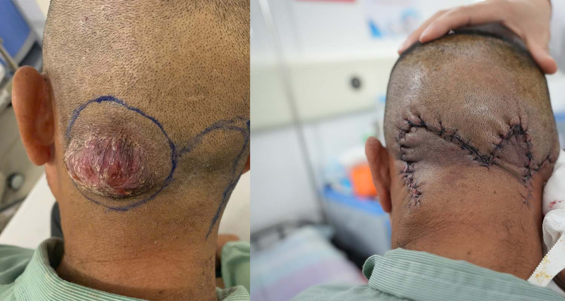 Bệnh nhân Nguyễn V V (1969, trú tại Vân Đồn, Quảng Ninh) có tiền sử ung thư tuyến giáp giáp di căn hạch cổ, phổi, đã phẫu thuật và điều trị I-ốt (I131 ), đang duy trì hormon levothyroxine và khám kiểm tra định kỳ. Khoảng 5 tháng nay, bệnh nhân xuất hiện khối u sùi da đầu vùng chẩm, đã phẫu thuật cắt u hai lần tại bệnh viện tuyến huyện. Sau mỗi lần cắt u tái phát và tiến triển rất nhanh. Thời điểm được chuyển lên bệnh viện Bãi Cháy, khối ung thư da đã lan rộng với đường kính 7cm khiến việc phẫu thuật cắt u và thiết kế chuyển vạt rất khó khăn. Các bác sĩ đã khám và hội chẩn chỉ định phẫu thuật, lên kế hoạch kỹ lưỡng cho việc cắt rộng u và chuyển vạt che phủ tổn khuyết. Ca mổ diễn ra thành công, sau phẫu thuật, vạt chuyển hồng hào, vết mổ khô, liền sẹo nhanh.