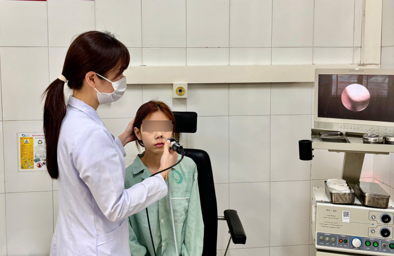 BSCKI Hoàng Huyền Trang – Phó Trưởng Khoa Tai mũi họng, Bệnh viện Bãi Cháy thăm khám cho bệnh nhân sau phẫu thuật