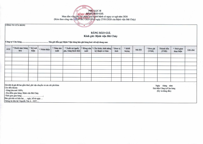 Thông báo số 188 về nhu cầu mua sắm vòng đeo tay phân loại người bệnh có nguy cơ ngã năm 2026 2026/01/27 08:31