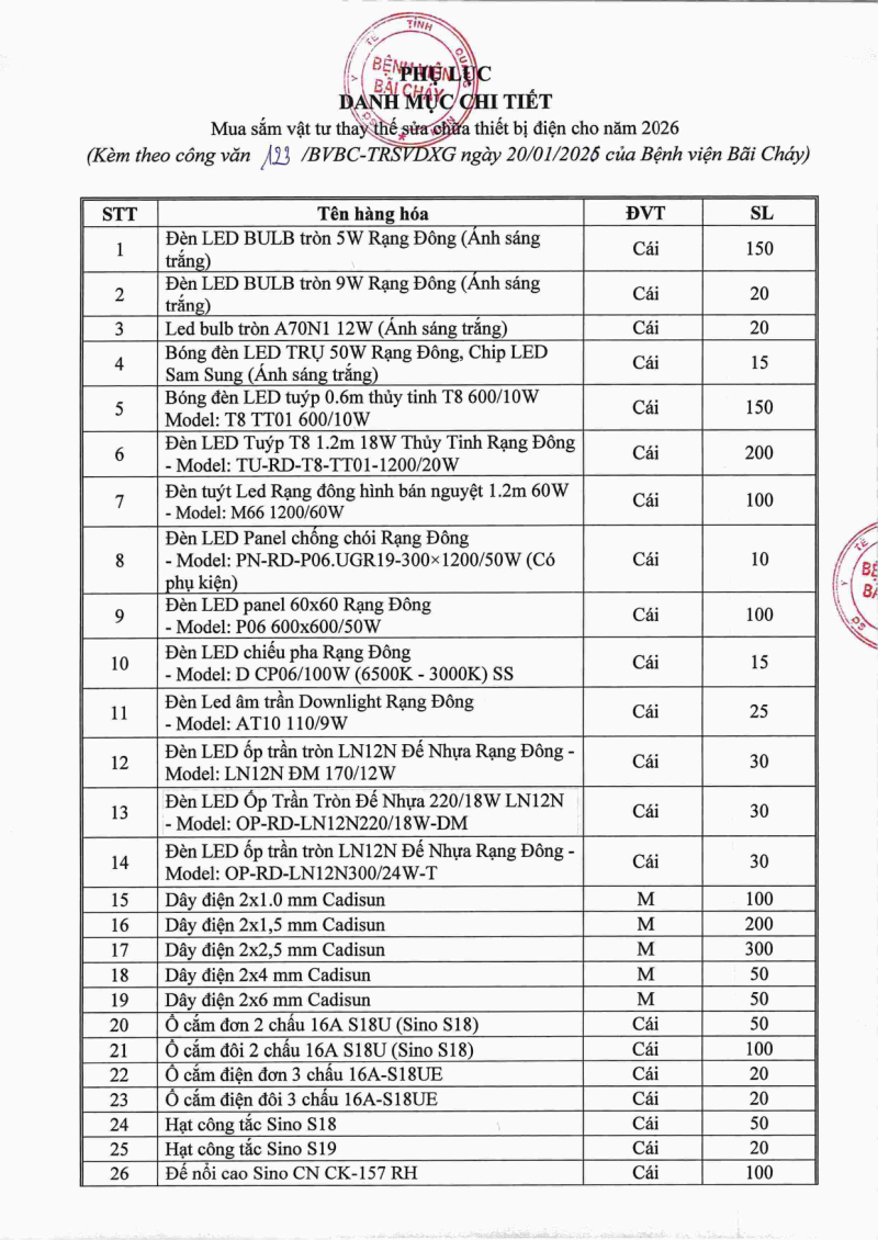 Thông báo 123 nhu cầu mua sắm vật tư thay thế sửa chữa thiết bị điện năm 2026 2026/01/21 08:12 Thông báo 123 nhu cầu mua sắm vật tư thay thế sửa chữa thiết bị điện năm 2026