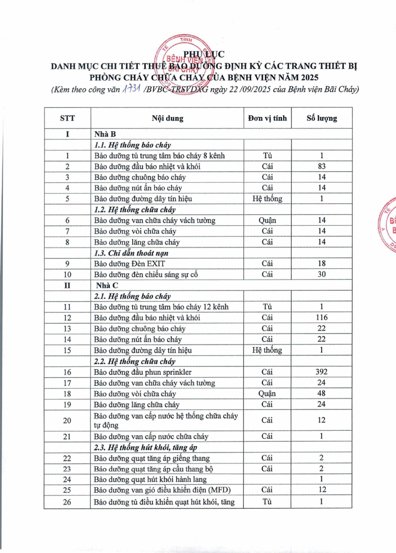 Thông báo 1731 nhu cầu thuê bảo dưỡng định kỳ các trang thiết bị phòng cháy chữa cháy