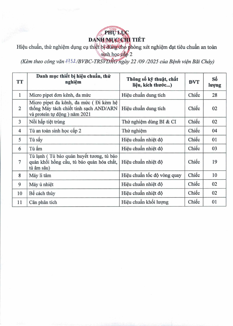 Thông báo 1732 nhu cầu hiệu chuẩn, thử nghiệm dụng cụ thiết bị dùng cho phòng xét nghiệm đạt tiêu chuẩn an toàn sinh học cấp 2