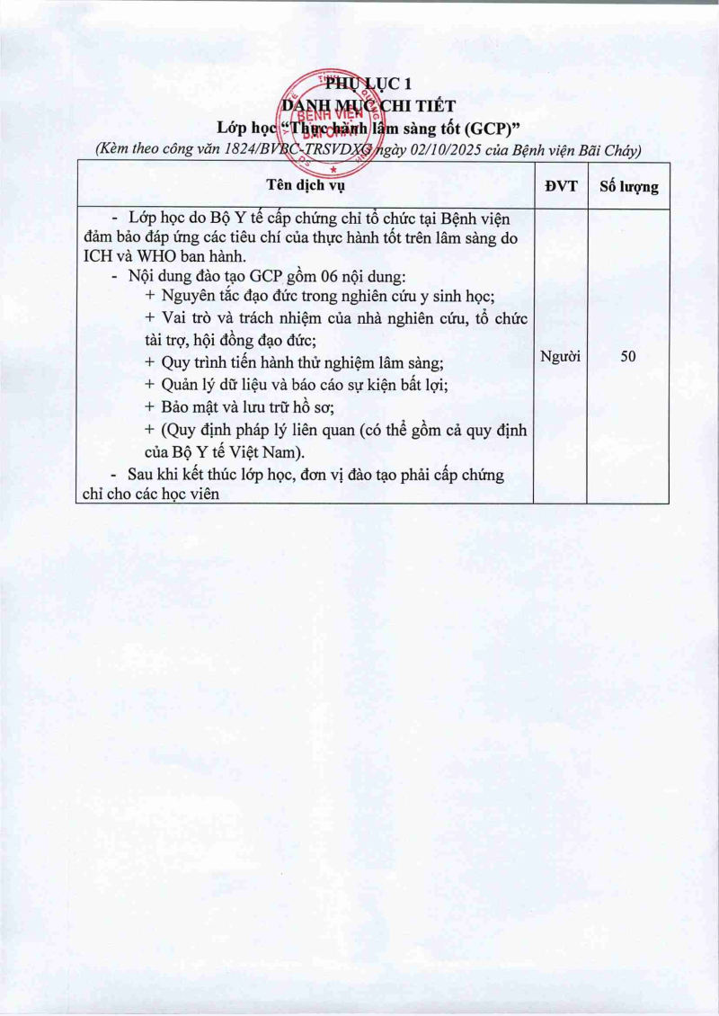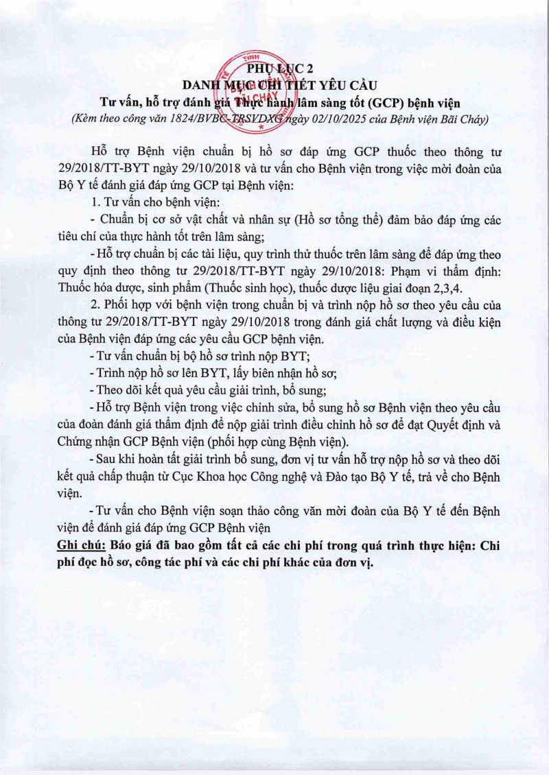 Thông báo 1824 về nhu cầu tổ chức lớp tập huấn GCP và thuê đơn vị tư vấn, hỗ trợ đánh giá GCP tại bệnh viện 2025/10/02 09:04