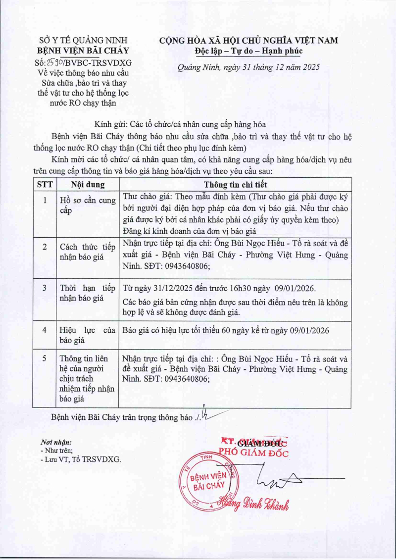 Thông báo 2590 nhu cầu sửa chữa, bảo trì và thay thế vật tư cho hệ thống lọc nước RO chạy thận\