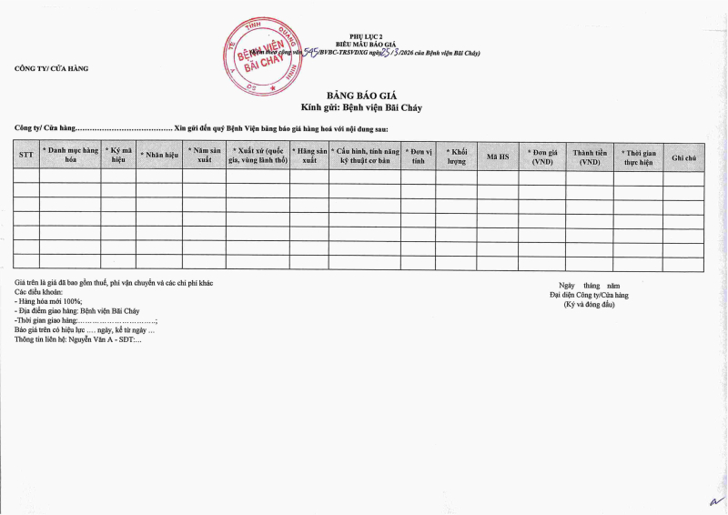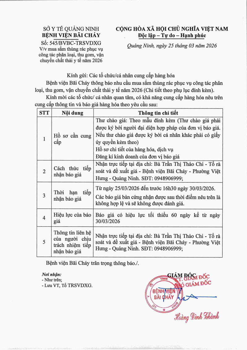 Thông báo số 544 về nhu cầu thuê đơn vị cung cấp dịch vụ phun thuốc diệt muỗi và côn trùng phòng chống dịch tại bệnh viện Bãi Cháy năm 2026
