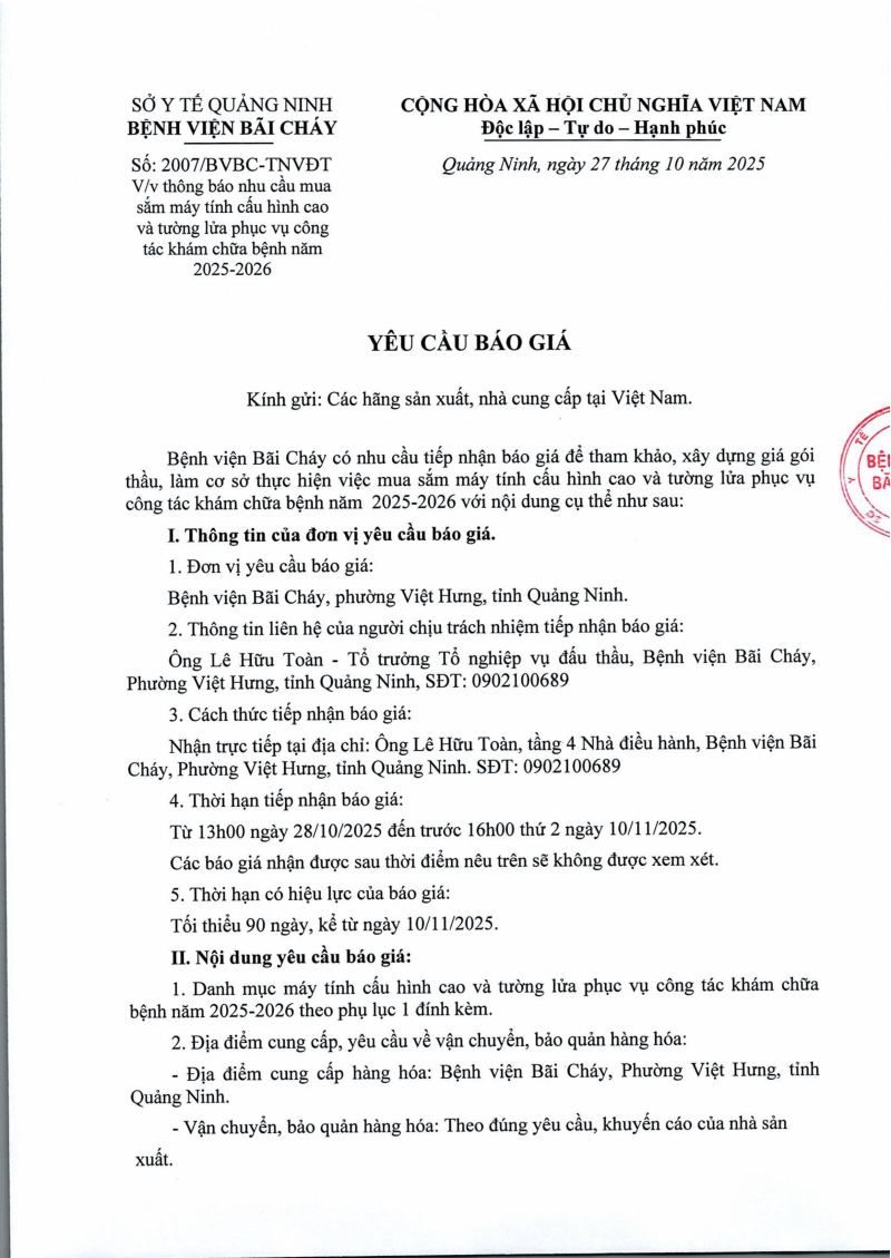 Thông báo số 2007 về nhu cầu mua sắm máy tính cấu hình cao và tường lửa phục vụ công tác khám chữa bệnh 2025/10/28 09:00