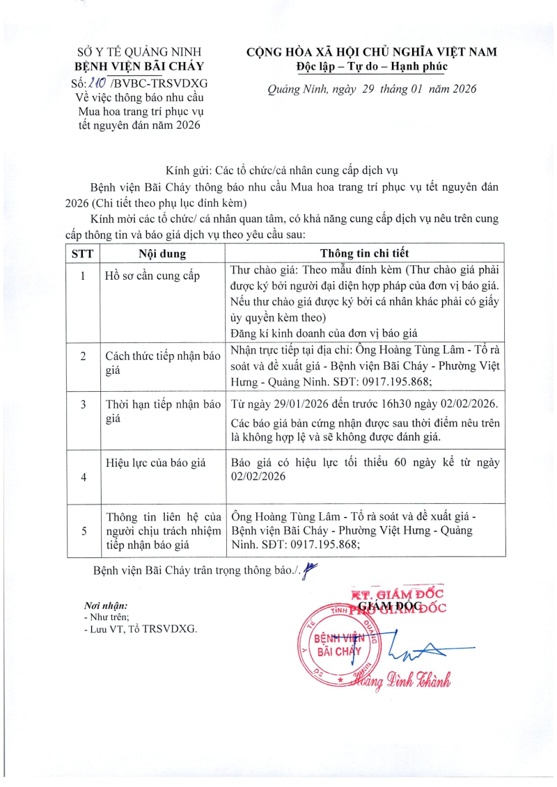 Thông báo số 212 về nhu cầu mua bánh kẹo phục vụ tết Bính Ngọ năm 2026 của Bệnh viện Bãi Cháy