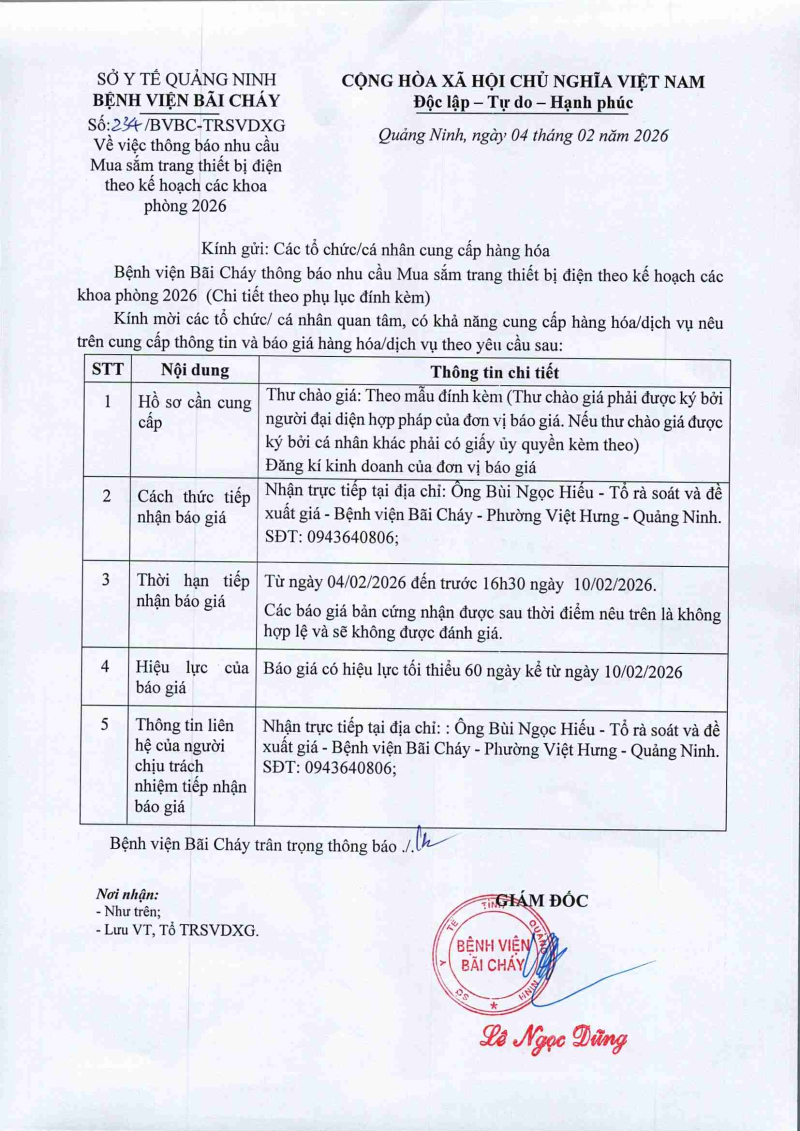 Thông báo số 234 về nhu cầu mua sắm trang thiết bị điện theo kế hoạch các khoa phòng 2026 2026/02/06 01:50