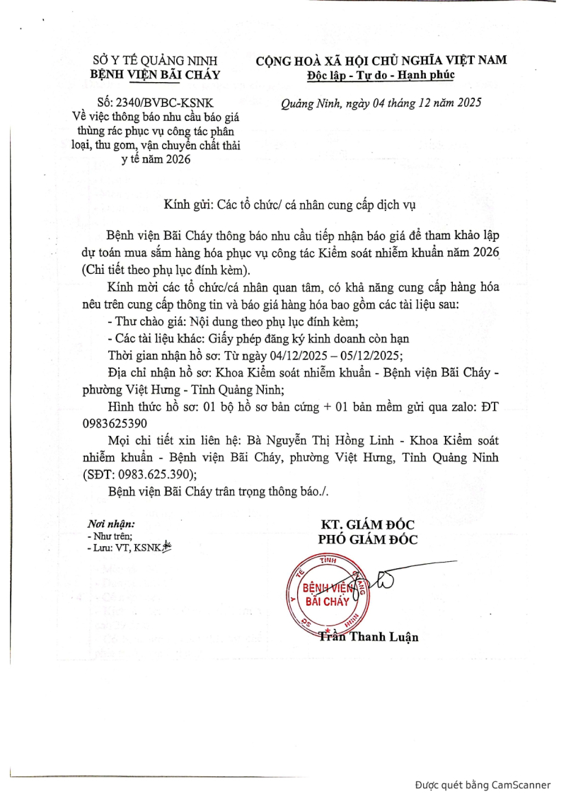 Thông báo số 2340 về nhu cầu báo giá thùng rác phục vụ công tác phân loại, thu gom và vận chuyển chất thải y tế năm 2026 2025/12/04 04:12