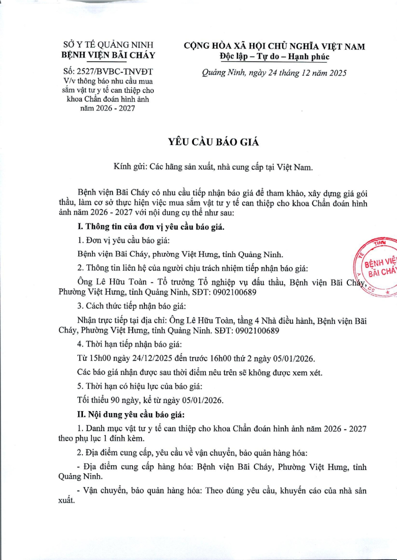 Thông báo số 2527 về nhu cầu mua sắm vật tư y tế can thiệp cho khoa chẩn đoán hình ảnh năm 2026 -2027 2025/12/24 03:27