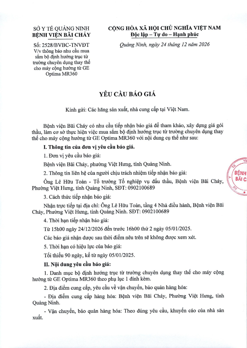 Thông báo số 2528 về nhu cầu mua sắm bộ định hướng trục từ trường chuyên dụng cho máy chụp cộng hưởng từ GE Optima MR 360 2025/12/24 06:33