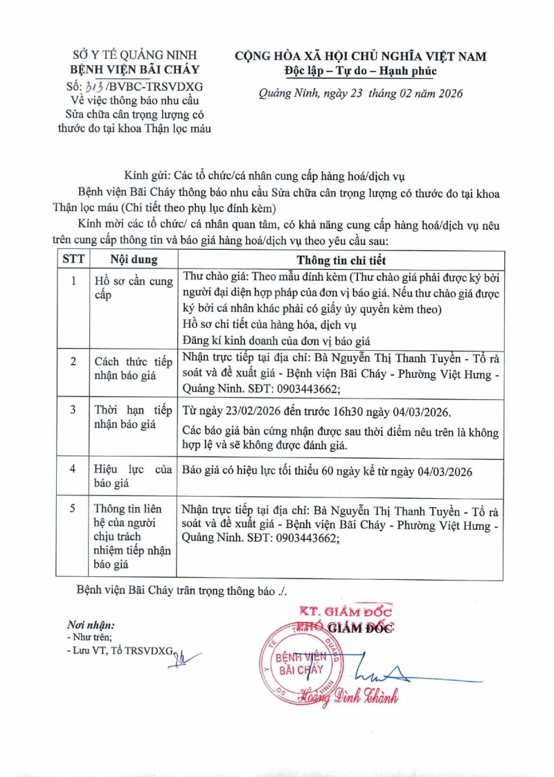 Thông báo số 313 về nhu cầu sửa chữa cân trọng lượng có thước đo tại khoa Thận lọc máu 2026/02/23 08:09