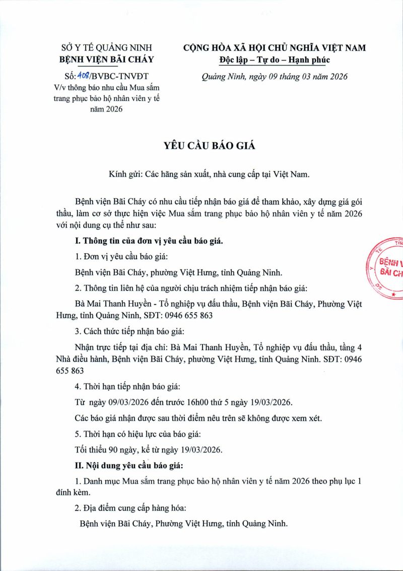 Thông báo số 408 về nhu cầu mua sắm trang phục bảo hộ nhân viên y tế năm 2026